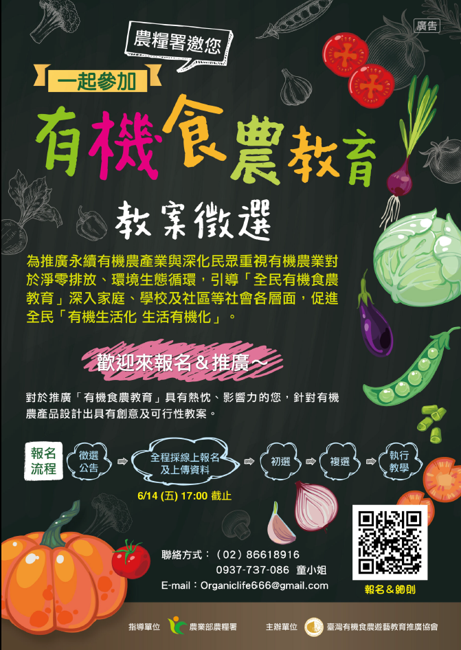 轉知:社團法人台灣有機食農遊藝教育推廣協會辦理「農糧署113年度有機食農教育教案徵選」。