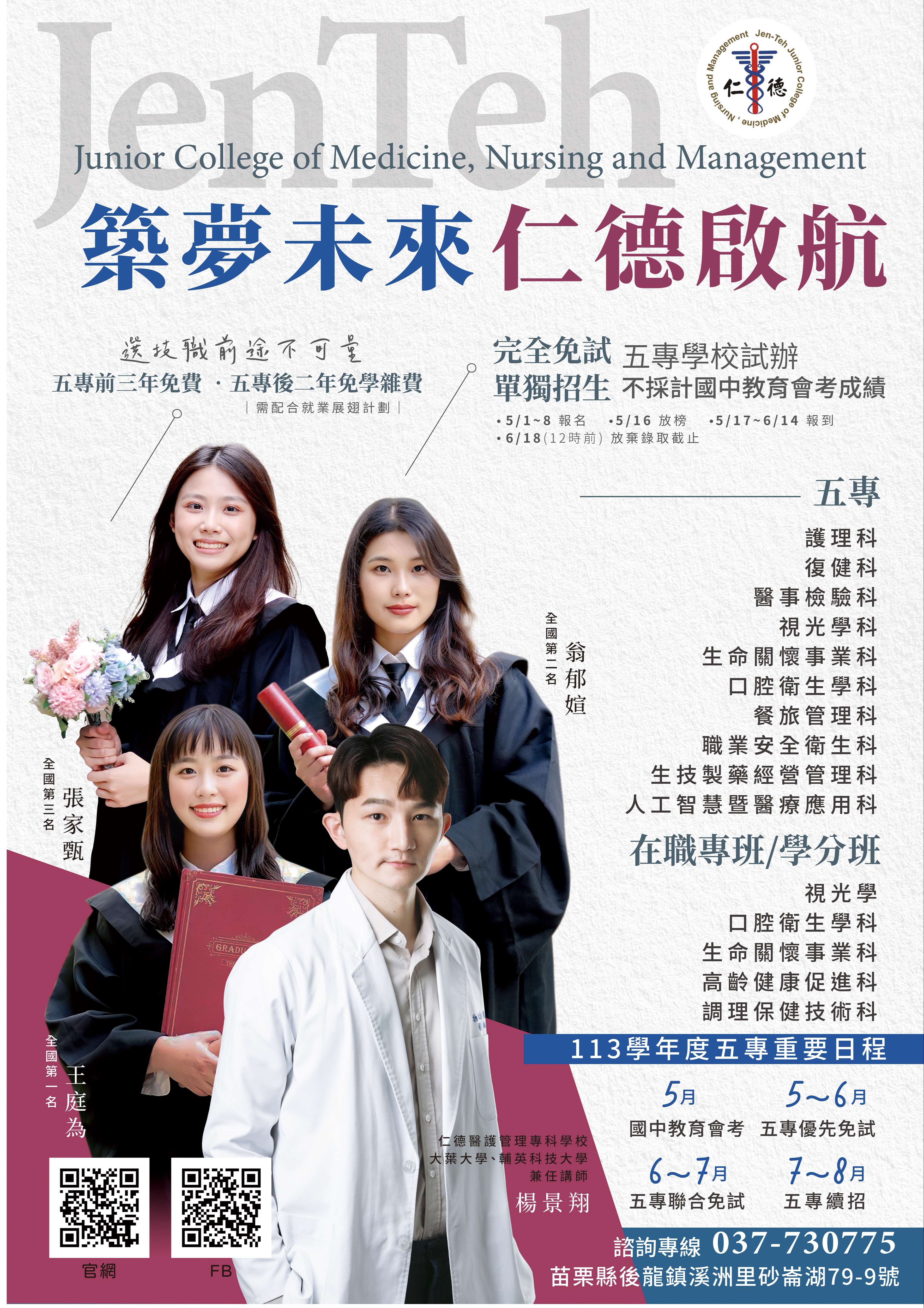 一、該校辦理「113學年度完全免試入學單獨招生」,報名時間 為113年5月1日10:00起至5月8日(三)17:00止,學生於5 月8日報名截止日前填寫「就讀意願表」,放榜錄取後並於 6月6日之前完成報到者,可領取6,000元早鳥獎學金,簡章 下載網址:https://exam5w.jente.edu.tw。