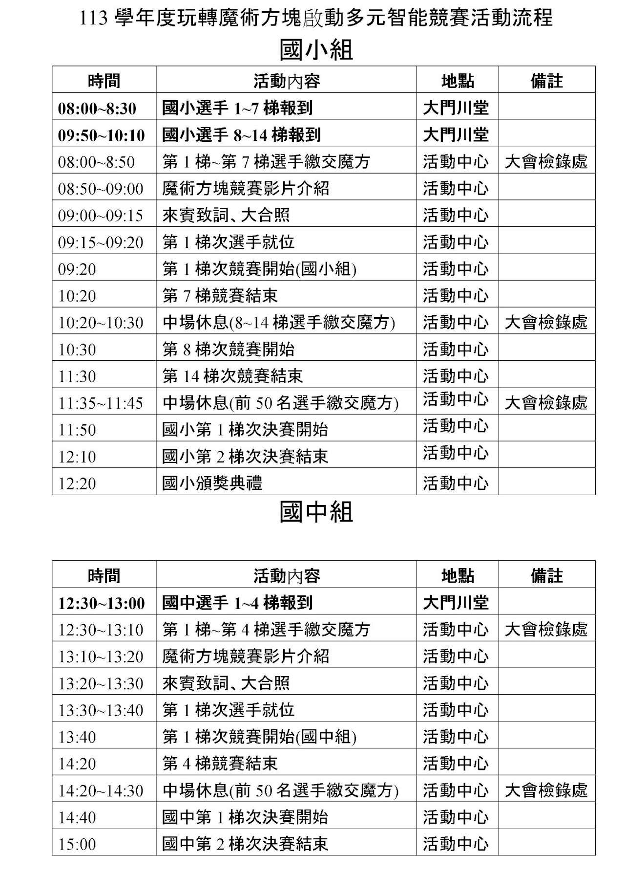 一、依臺北市政府教育局113年8月23日北市教國字第 11330890631號函辦理。 二、報到時間: (一)國小組:113年 12月8日星期日 上午 9 時起 1、1~7梯08:00~08: 30 辦理報到 。 2、8~14梯09:50~10:10辦理報到 (二)國中組:113年 12月8日星期日 下午1時起 1、1~4梯12:30~13: 00 辦理報到 。 (三)賽前說明會 113年11月22日星期五 15:00~16:00 線上會 議室 https://meet.google.com/wfi puew aba。(同步 在網站上) 三、選手梯次桌號詳見網站:https://reurl.cc/r3x2eO 四、承辦學校及競賽地點:臺北市大安區幸安國民小學(活動 中心)。 五、報名及競賽相關事宜請詳閱實施計畫,若有疑問請洽幸安 國小教務處林冠廷主任(02-27074191轉3100)。