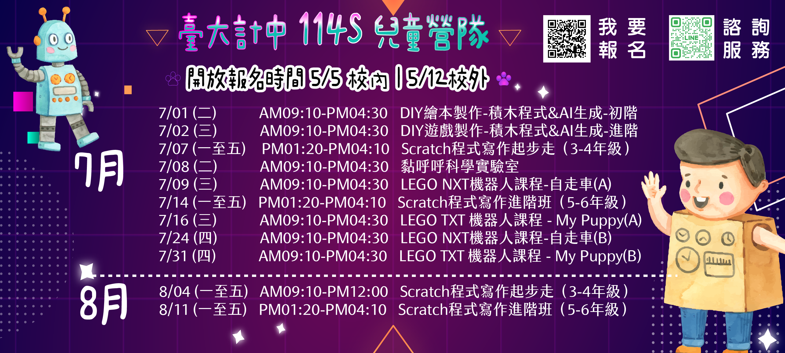 一、本校計算機及資訊網路中心於114年6月18日起辦理暑假資訊應用課程,課程詳細資訊與報名網址請至該中心網站查詢https://teach.cc.ntu.edu.tw/course。