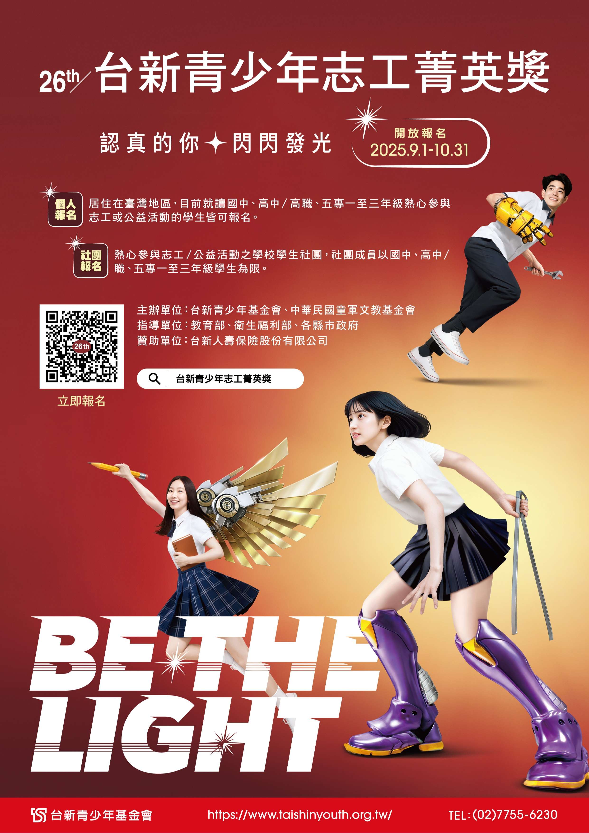 三、為帶動更多青年參與志願服務,請協助宣導,並鼓勵所屬 學生報名。另為推廣青少年志願服務,該會與公共電視合 作紀錄片《BE THE LIGHT-青春作夥行》,並辦理校園特映 暨映後座談,如有意舉辦,亦請逕與該會聯繫。