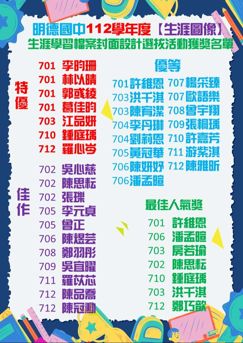 本校112學年度生涯圖像-生涯學習檔案封面設計選拔優勝名單如附件