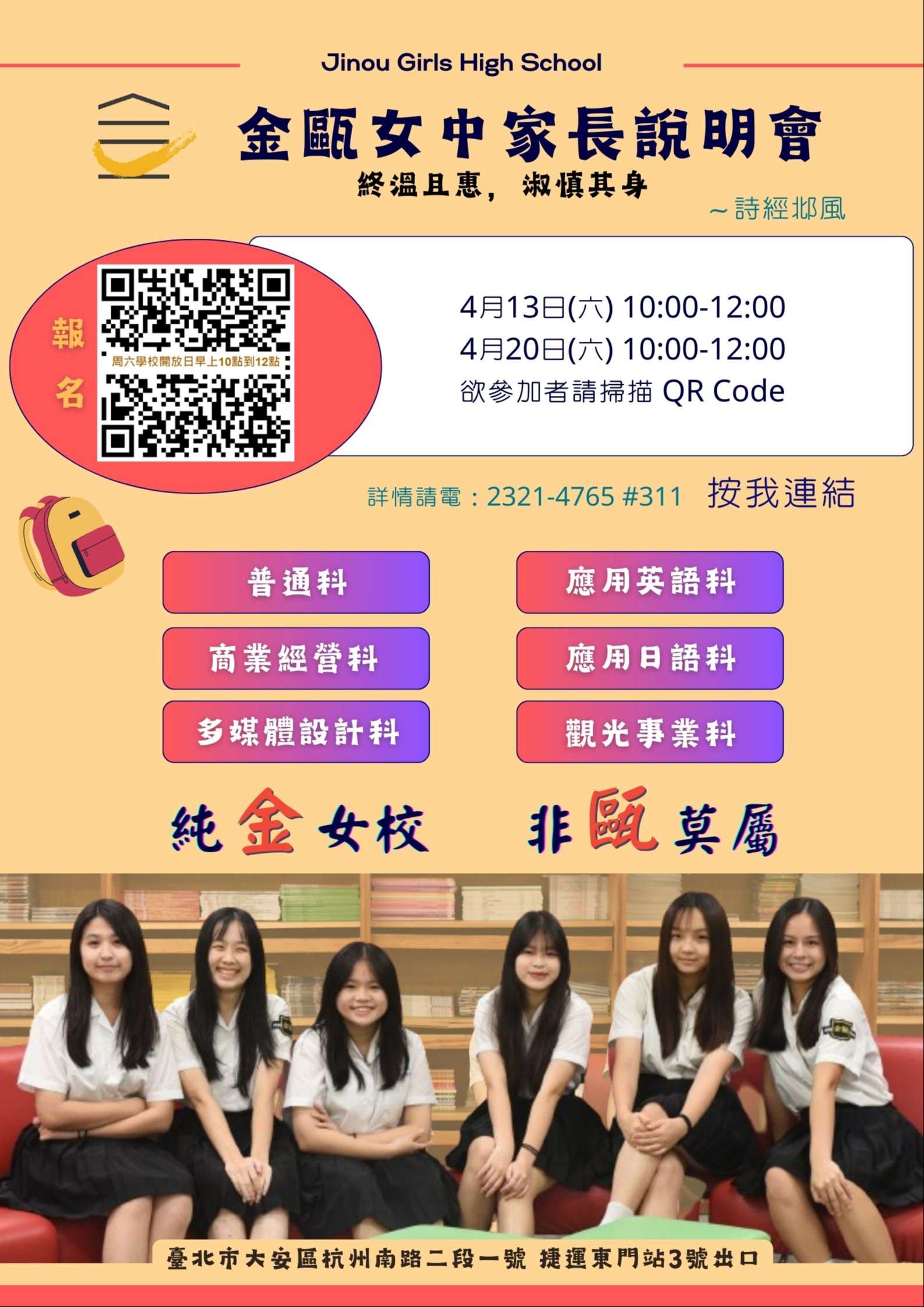 報名方式:即日起至113年4月19日(星期五)止,請逕至金 甌女中首頁(網址:https://www.cogsh.tp.edu.tw/home) 或直接至Googleq表單(網址:https://forms.gle /EPBVKaAMf1hcdneRA)報名參加。