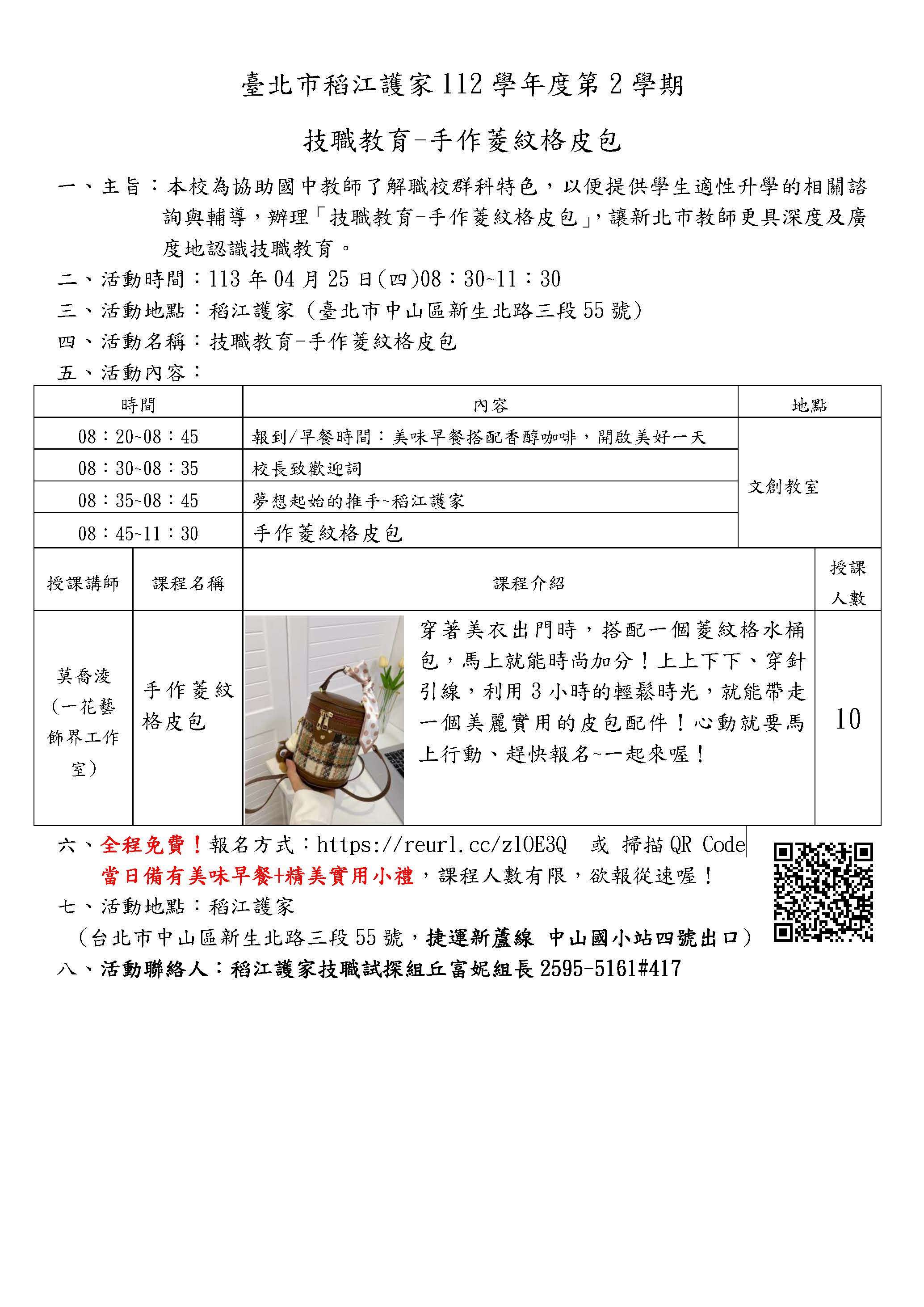 二、本校於113年4月25日(四)上午8:30-11:30,辦理「技職 教育-手作菱紋格皮包」。誠摯邀請教師及輔導學生升學相關行政人員踴躍報名參加,全程免費。