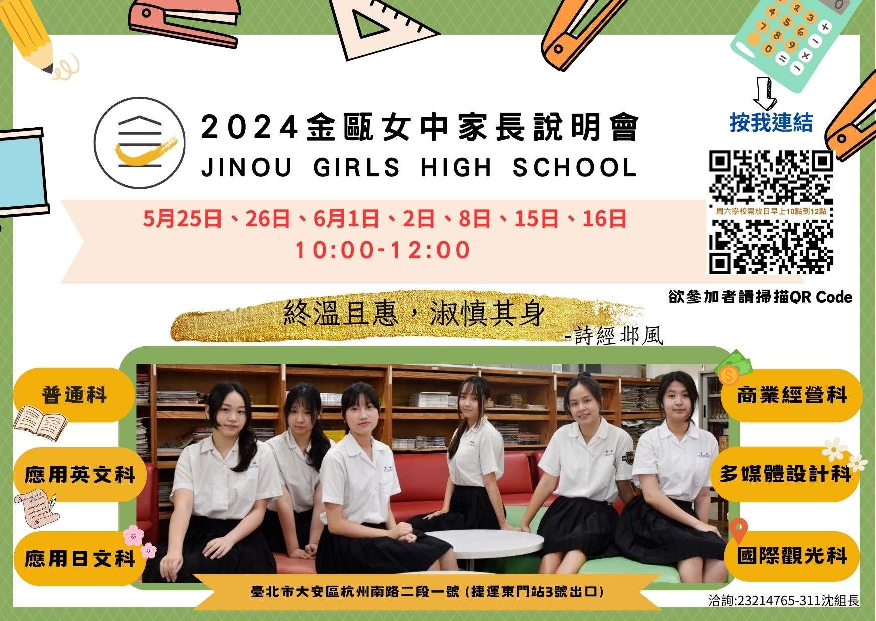 二、報名方式:即日起至113年6月15日(星期六)止,請逕至金 甌女中首頁(網址:https://www.cogsh.tp.edu.tw/home) 或直接至Google表單(網址:https://forms.gle /EPBVKaAMf1hcdneRA)報名參加。