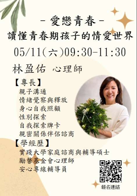 (一) 05/11(六)09:30-11:30,《愛戀青春 讀懂青春期孩子 的情愛世界》林盈佑心理師。