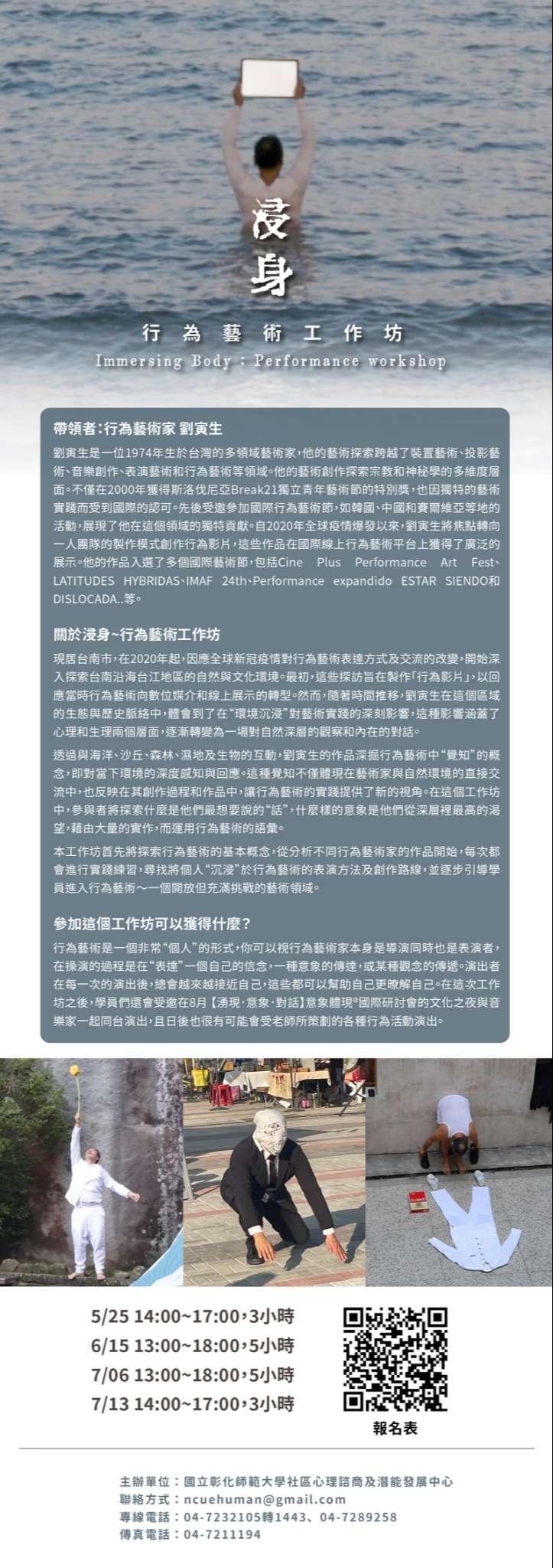 二、參加對象:本工作坊不限專業人員,凡對「浸身~行為藝 術工作坊」主題有興趣者,歡迎參加。