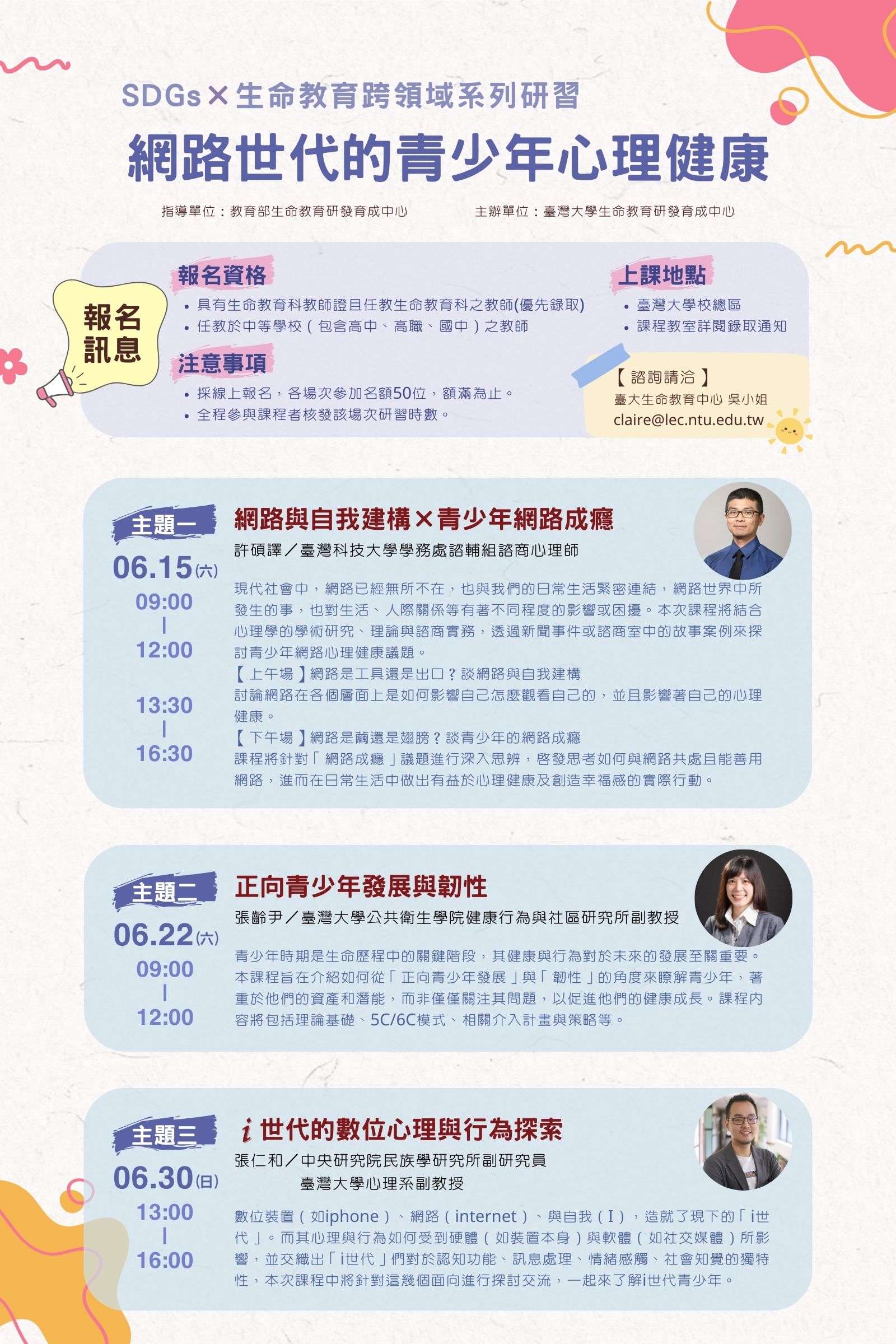 一、本研習規劃3個場次,詳細內容請參閱簡章或官網。