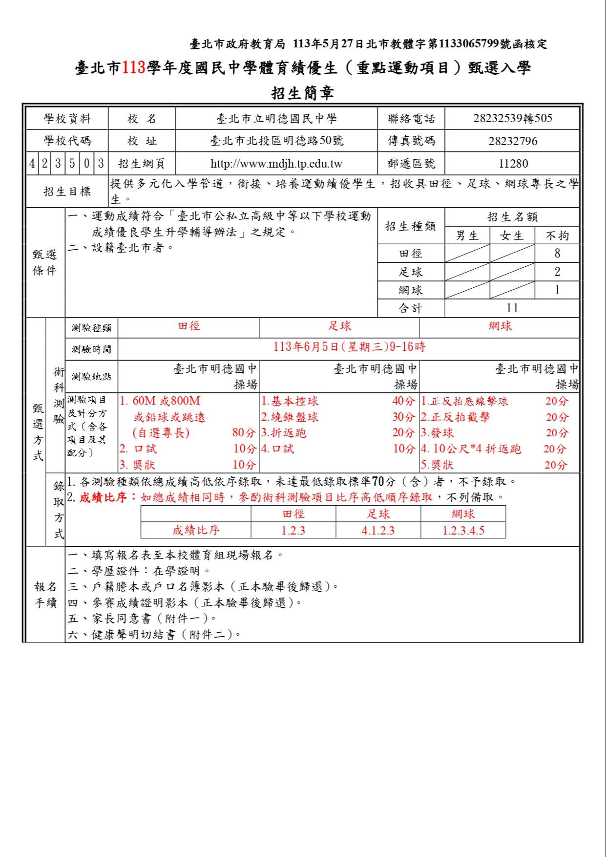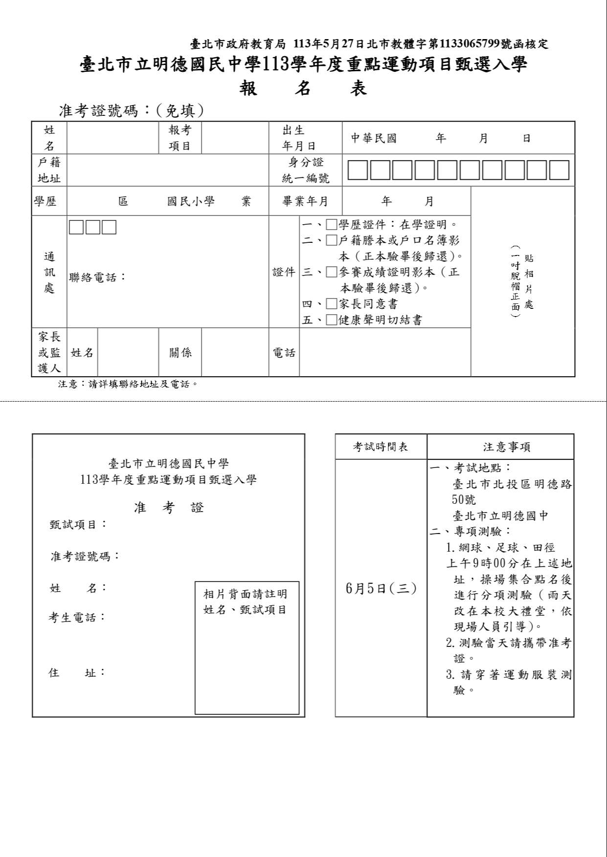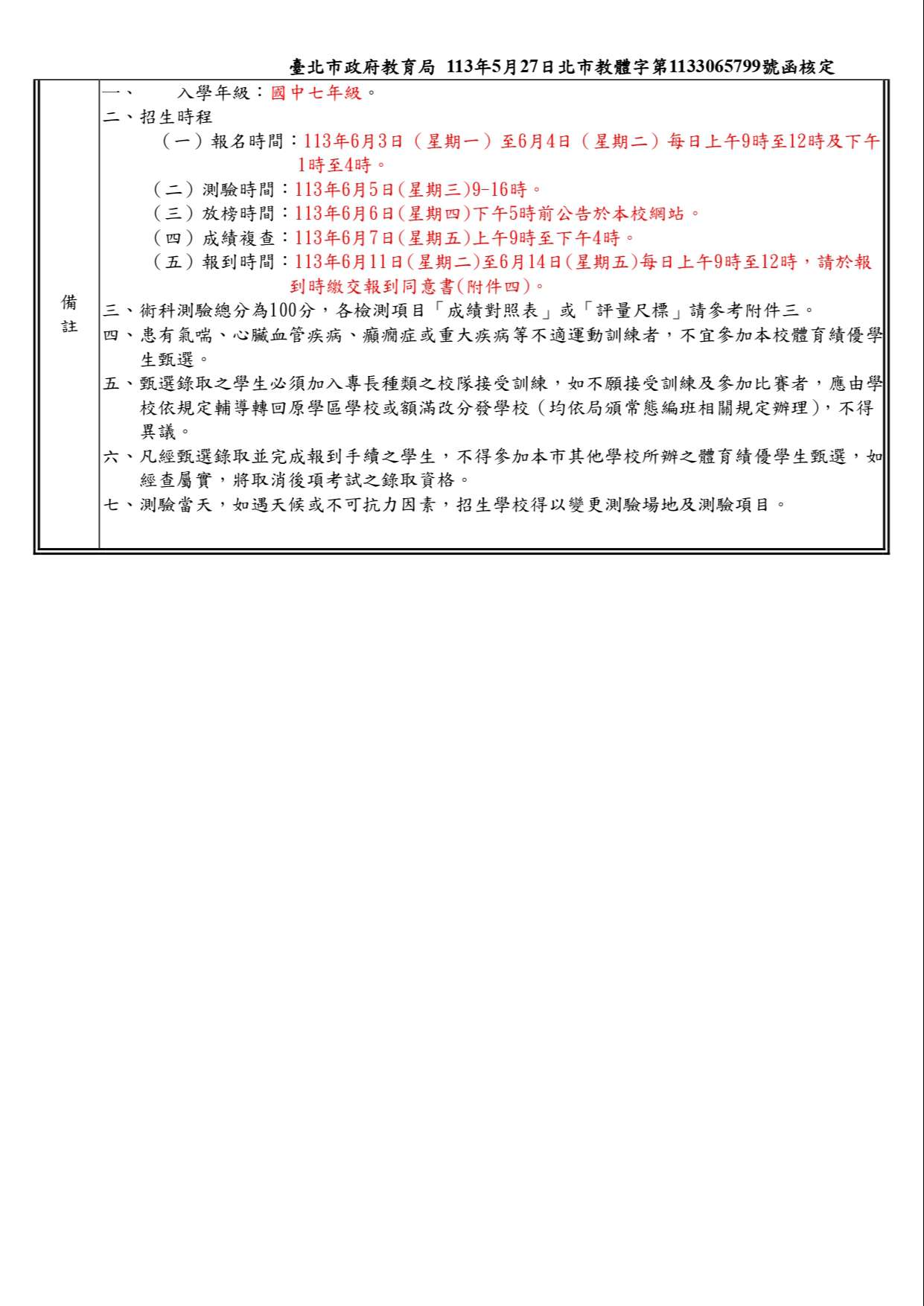 因教育局規定113學年度重點運動項目招生考試測驗時間為6/5(三)上午九點