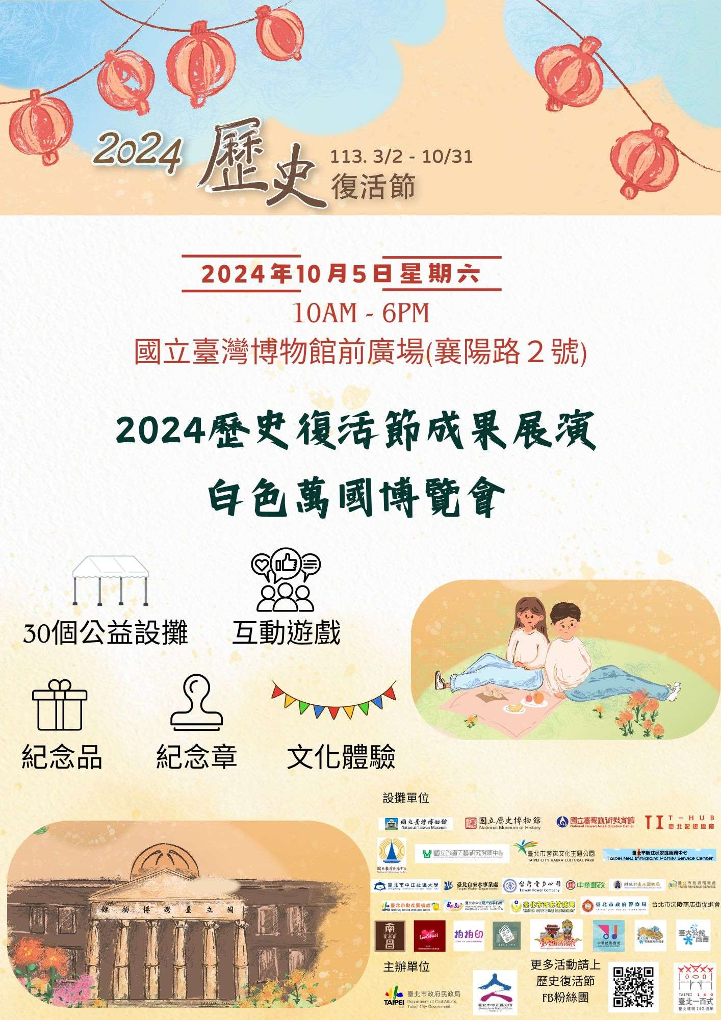 113年度基層藝文活動「2024歷史復活節:白色萬國博 覽會」將於113年10月5日(星期六)上午10時至下午6時假 二二八和平公園-國立臺灣博物館本館(襄陽路2號)前廣 場舉辦