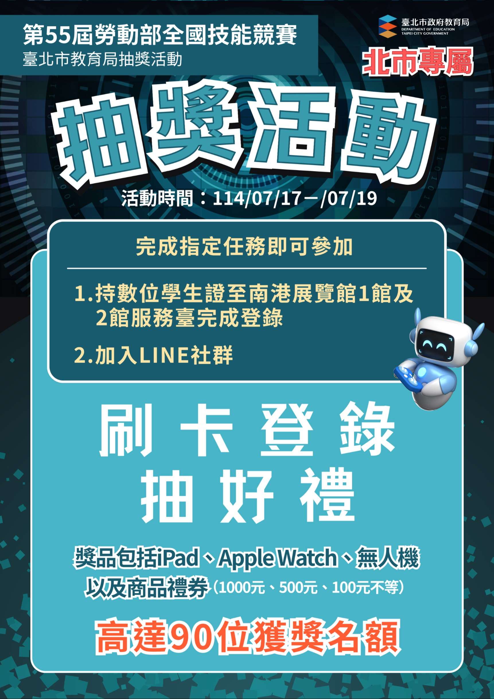 五、現場提供本市學生限定好禮抽獎活動,凡本市各級學校學 生持數位學生證至南港展覽館1館及2館,至大會服務臺完 成登錄即可參加抽獎,獎品包括平板電腦、智慧手錶、無 人機、以及商品禮券(1000元、500元、100元不等),高 達90位獲獎名額。 五、旨揭競賽資訊請洽以下宣傳平臺,請各校於校園佈告欄、 跑馬燈或相關處室協助宣傳。