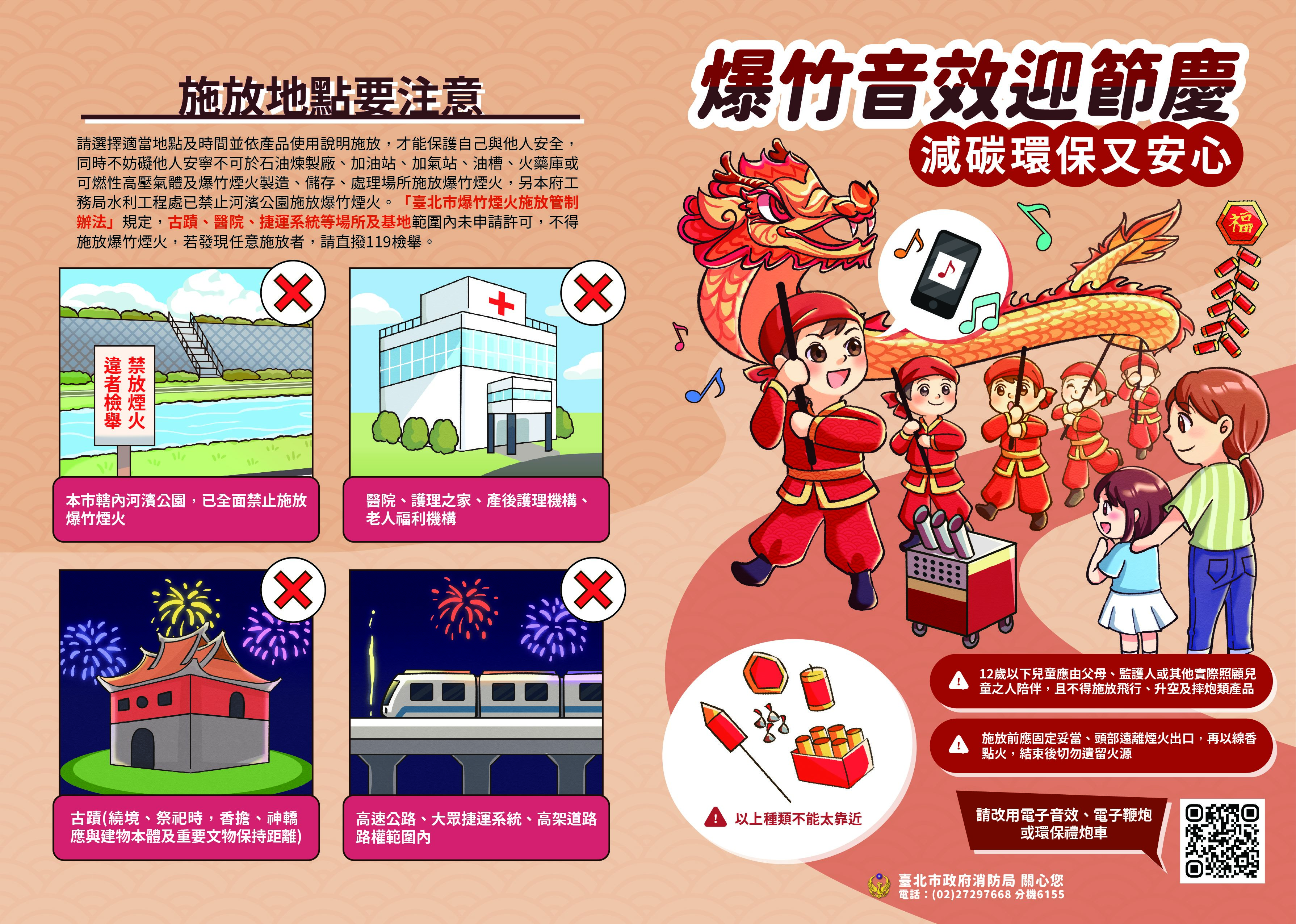 四、「臺北市爆竹煙火施放管制辦法」已規範高速公路、大眾 捷運系統及高架道路路權範圍內、古蹟、醫院、護理之 家、產後護理機構及老人福利機構等場所及基地範圍內,不得施放爆竹煙火,請協助宣導以電子鞭炮或爆竹音效替 代傳統爆竹燃放,爆竹燃放音效可至本市消防局網站 (https://reurl.cc/LpX1N7 )下載使用。