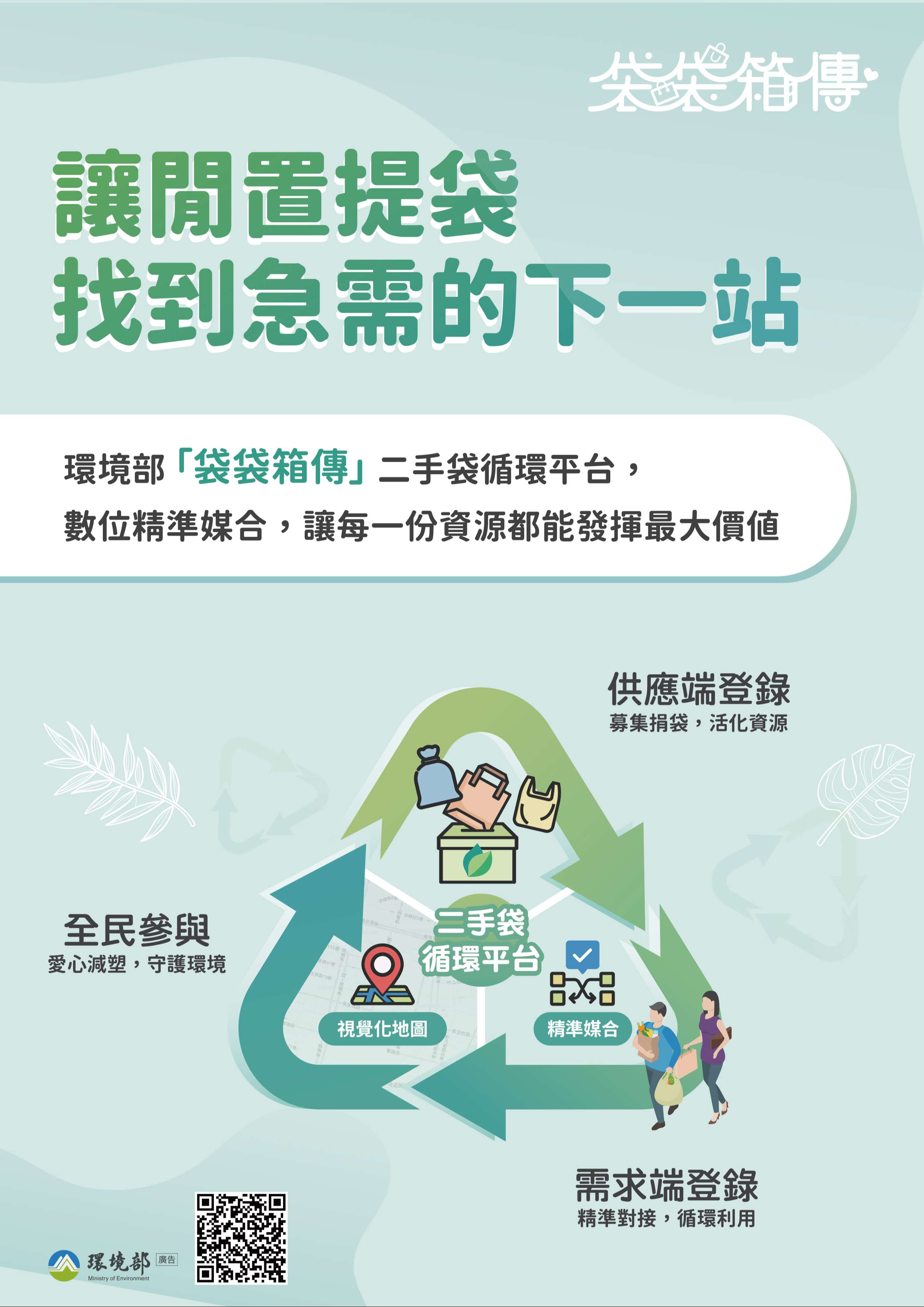 二手袋循環平台(https://sup.moenv.gov.tw/Page /rebag),如 有大量閒置的二手袋,可至上述平台供應端登錄物資