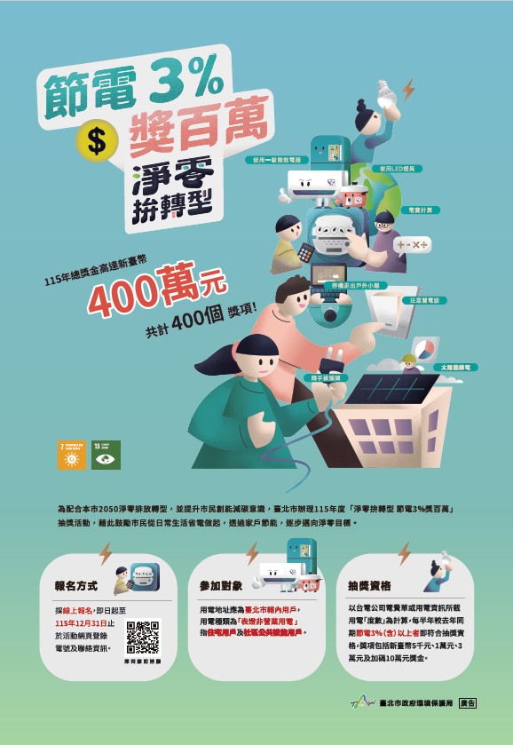 為鼓勵市民落實節能減碳行動,環保局115年「淨零拚轉型 節電3%獎百萬」抽獎活動(網址: https://energysaving. gov.taipei/),即日起至115年 12月31日辦理。詳情洽同名活動網站或電洽1999分機7232。