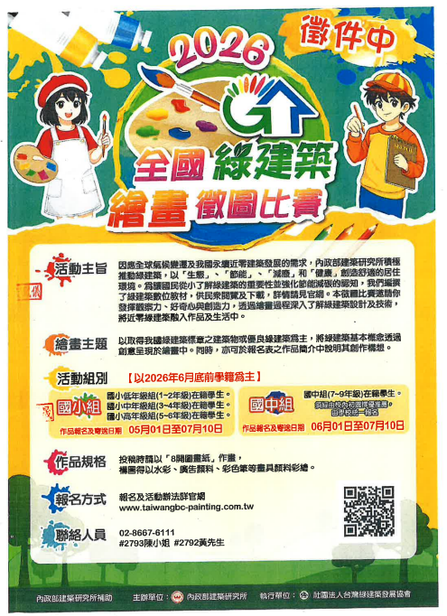 (四)活動詳情與報名資訊,請至本所補助單位社團法人台灣 綠建築發展協會比賽官網(www.taiwangbc-painting. com.tw)查詢,或撥打聯絡電話(02)8667-6111分機 2793、2792洽詢。